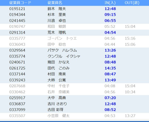出退勤の打刻情報をもとに、離れた場所からでも勤務中の従業員をリアルタイムで確認することが可能。応援先での勤務状況の確認にも役立ちます。