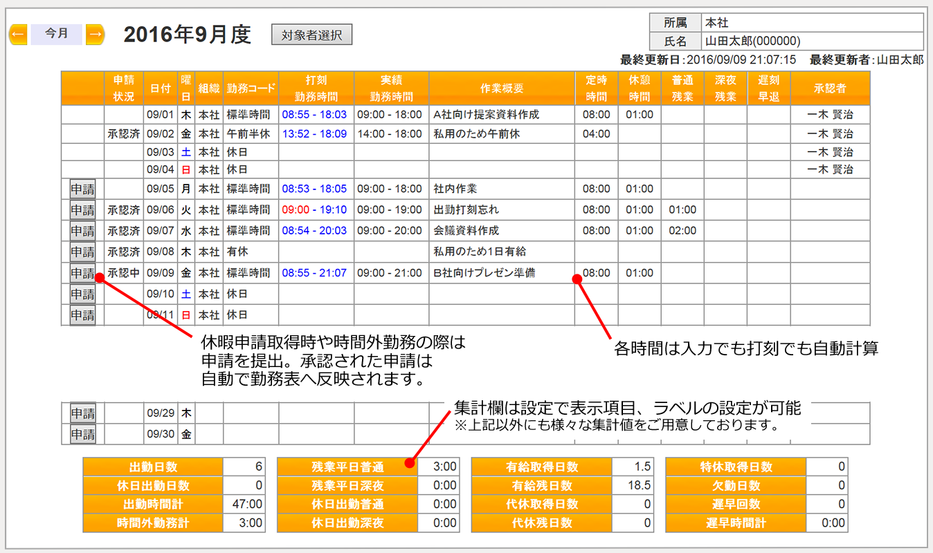 企業の勤怠管理に必要な機能(入力・集計・申請・承認)が一画面や関連画面に集約されており、Excel感覚で操作できる分かりやすいUIという印象です。各種のステータスが一覧表で見られるため、管理者・従業員の双方にとって業務効率を高める工夫が感じられます。